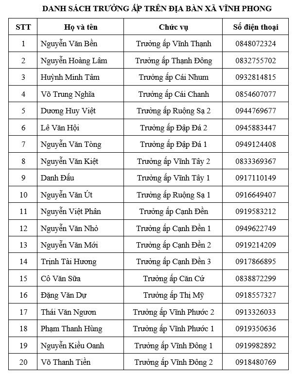 aA Ủy ban nhân dân DANH SÁCH TRƯỞNG ẤP TRÊN ĐỊA BÀN XÃ VĨNH PHONG 26/01/2026, 17:08 Quay về Chia sẻ Z Copy link thành công Tin khác ỦY BAN NHÂN DÂN XÃ Ủy ban nhân dân 20/01/2026 /danh-sach-truong-ap-tren-dia-ban-xa-vinh-phong