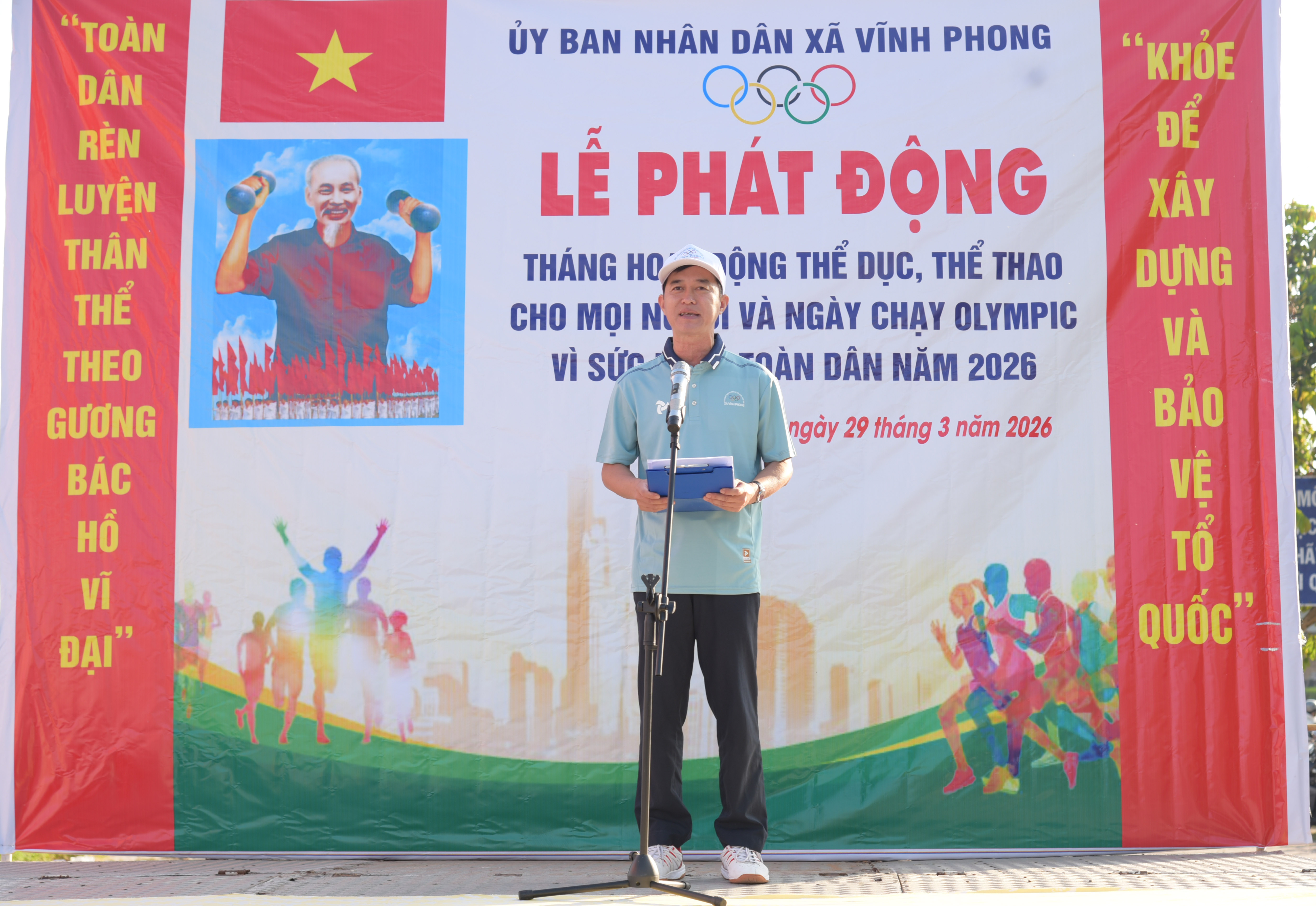 Sáng 29/3/2026, tại công viên 1 tháng 5, UBND xã Vĩnh Phong tổ chức Lễ phát động Ngày chạy Olympic vì sức khỏe toàn dân năm 2026 nhân kỷ niệm 80 năm ngày thành lập ngành Thể thao Việt Nam và ngày Bác Hồ viết bài “Thể dục và Sức khỏe” kêu gọi đồng bào tập thể dục (27/03/1946- 27/03/2026). Đến dự có đồng chí Nguyễn Quốc Phi, Phó Giám đốc Trung tâm đào tạo, huấn luyện Thi đấu thể dục, thể thao tỉnh An Giang, đồng chí Châu Ngọc Cẩn, UVBTV Đảng ủy, Phó Chủ tịch UBND xã, Trưởng Ban chỉ đạo Ngày chạy Olympic năm 2026. Hơn 2.000 đại biểu là lãnh đạo Đảng ủy, UBND xã, các ban ngành, đoàn thể xã, Ban giám hiệu các trường học cùng lực đoàn viên, thanh niên và học sinh trên địa bàn tham gia